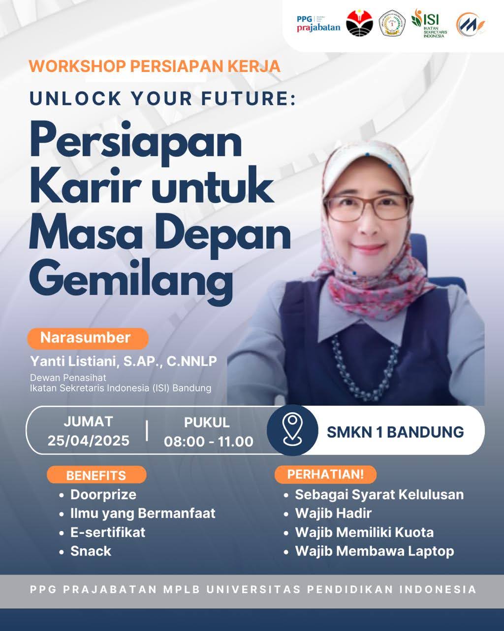 Kegiatan workshop sebagai bagian dari rangkaian program pengembangan Kepemimpinan Mahasiswa PPG Calon Guru Gelombang 2 Tahun Akademik 2024/2025 Universitas Pendidikan Indonesia bidang Studi Manajemen Perkantoran dan Layanan Bisnis (MPLB) dengan siswa jurusan MPLB SMKN 1 Bandung sebagai peserta workshop.